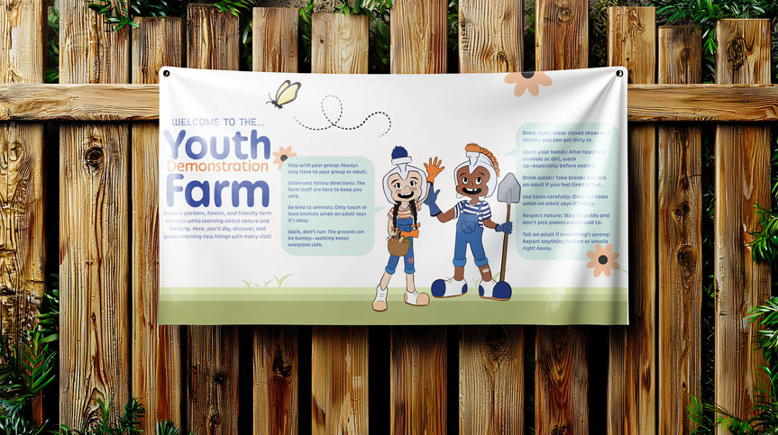 This collaborative project, completed with the VSU Special Topics VCAD Design Services team, focused on developing a kid-friendly visual identity for the Youth Demonstration Farm (YDF) at Randolph Farm. YDF serves as an educational space where K–12 students explore gardening, farming, and agriculture through a variety of themed areas such as the Heritage Heirloom Garden, Pollinator Garden, Virginia Crops, Compost, and more. Our goal was to create engaging mascots and supportive signage to help guide young visitors through the farm’s different plots. My contributions included designing the primary mascots, “Big Troy” and “Trina,” as well as collaborating on the overall signage system to enhance wayfinding and enrich the farm’s hands-on learning experience.